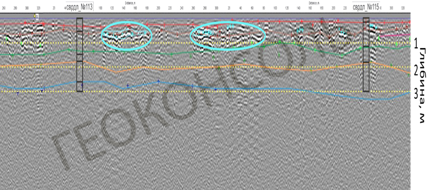Прослідковування границь між шарами ґрунту, калібровка даних по свердловинам та виявлення зон накопичення вологи